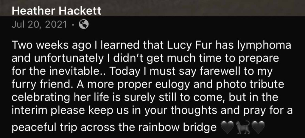 In the summer of 2021, my life was a dumpster fire in myriad ways and things especially reached a crescendo in the weeks after my cat, Lucy Fur, was diagnosed with feline lymphoma. The fact it was lymphoma, which took the lives of my father, grandmother, and uncle made it all the harder to accept the diagnosis – how many precious losses to the same fricking cancer can one person withstand, you know?